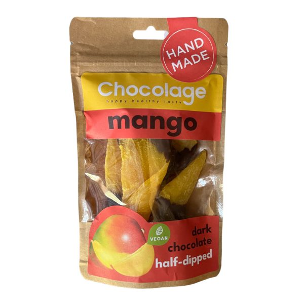 Dried Mango, Sugar Free Dark Chocolate (Cocoamass, cocoa butter, emulsifier (soybean lecithin), natural vanilla flavouring, maltitol). Dry cocoa solids 55,0 %.